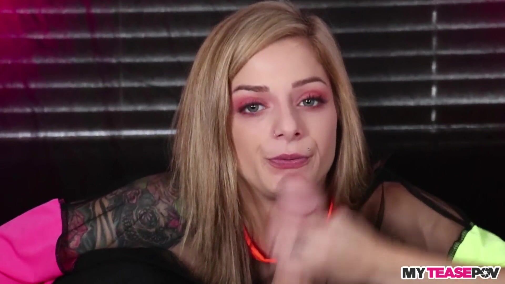 Teasing POV CFNM babe with tattoos and piercings sucks cock