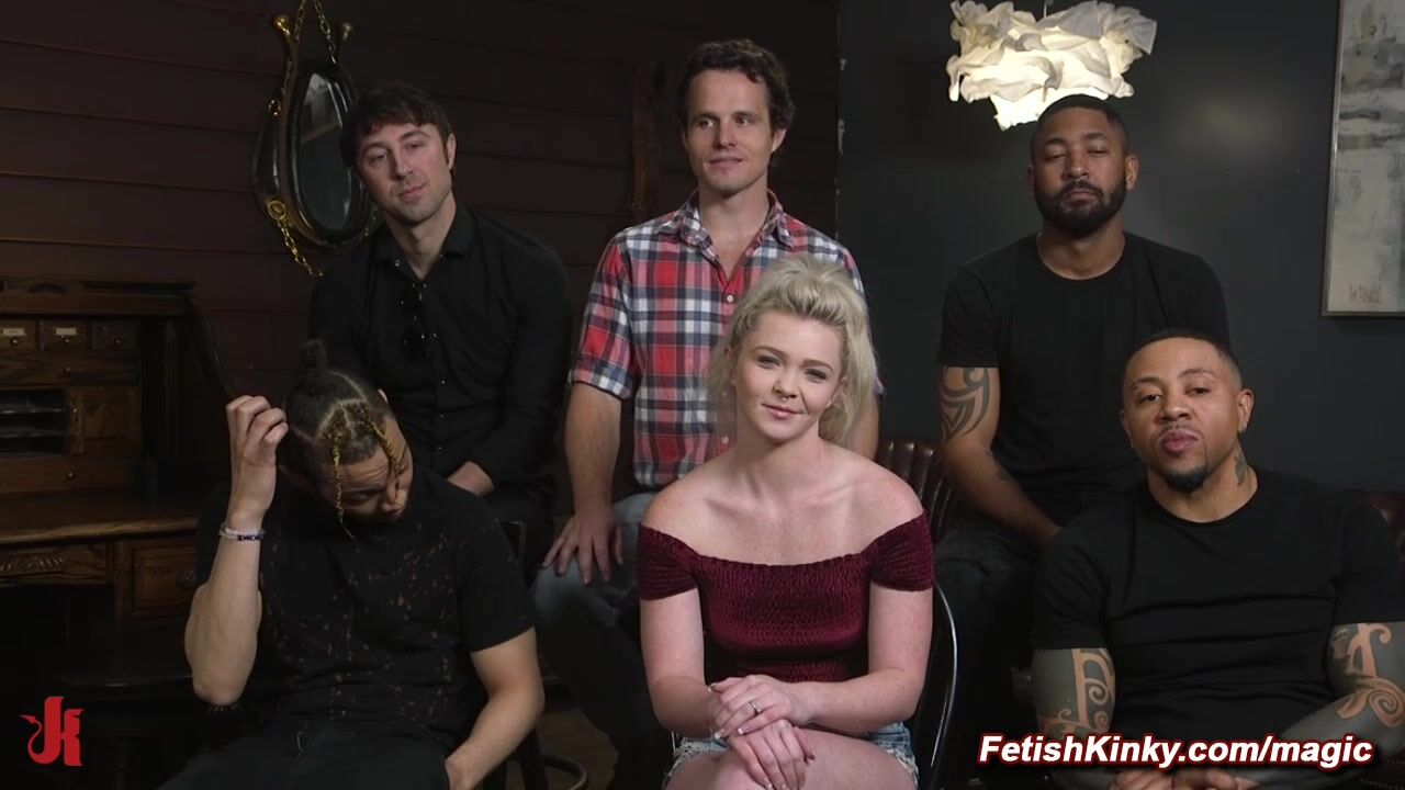 Cheating blonde fucked by five cocks in rope bondage